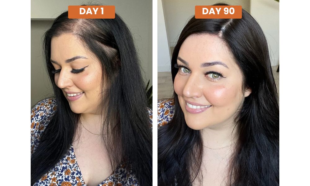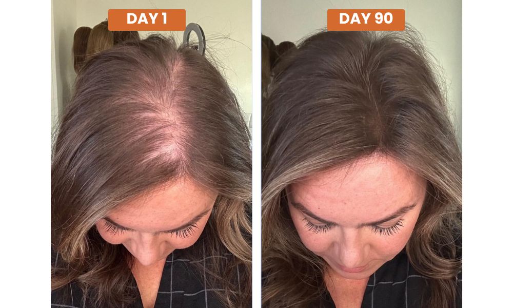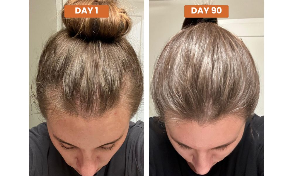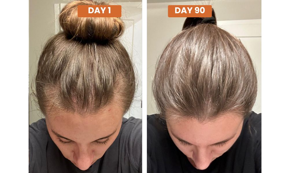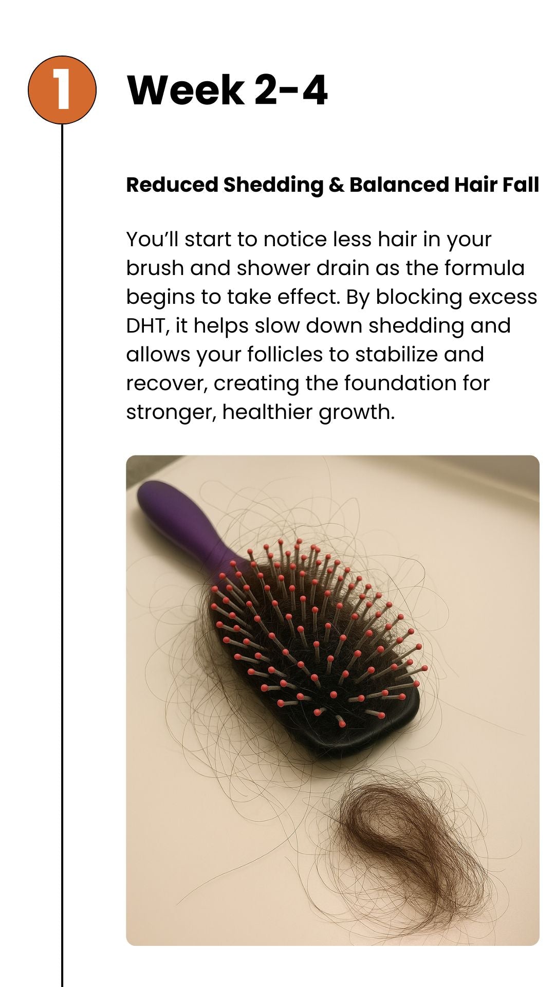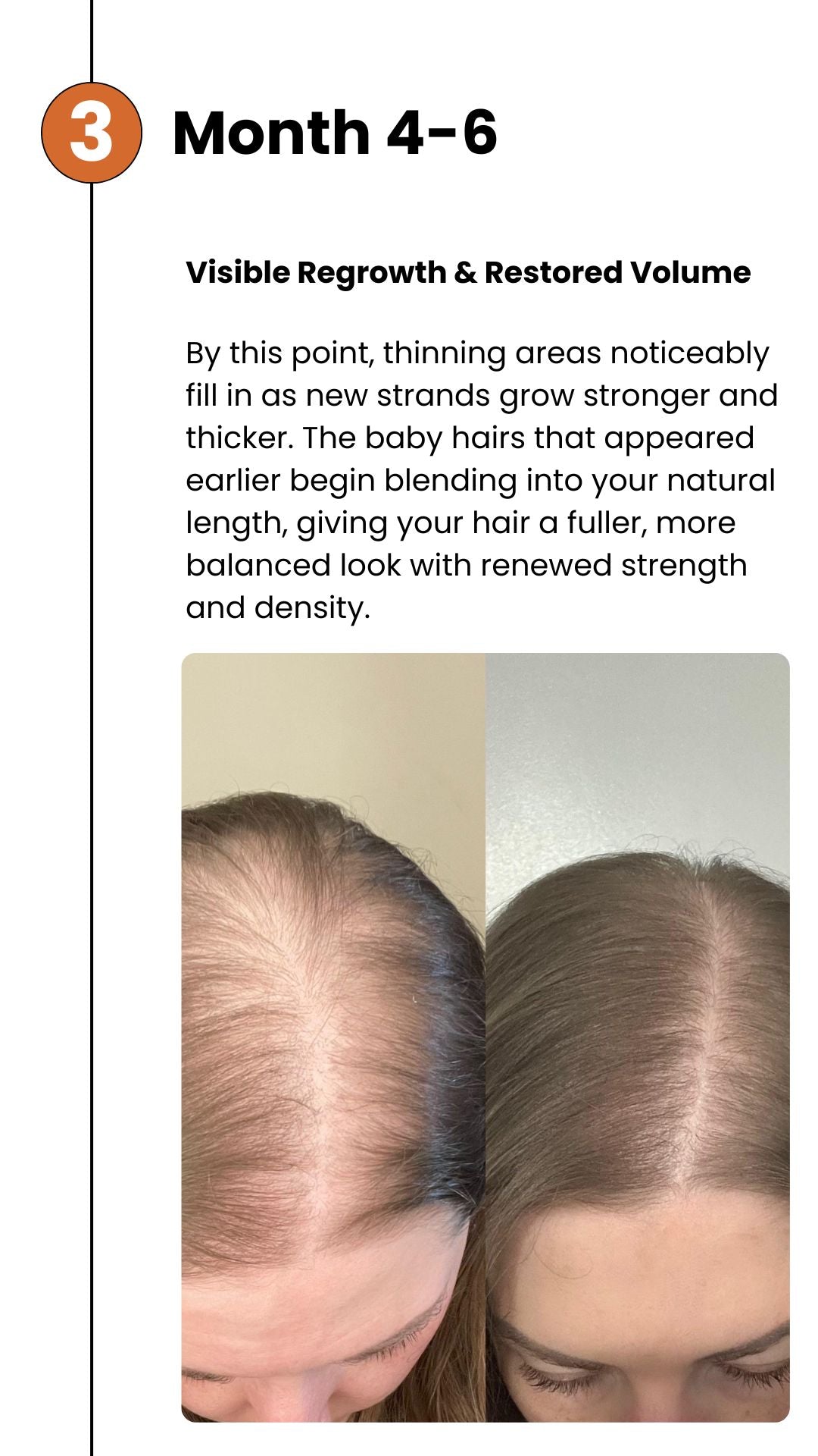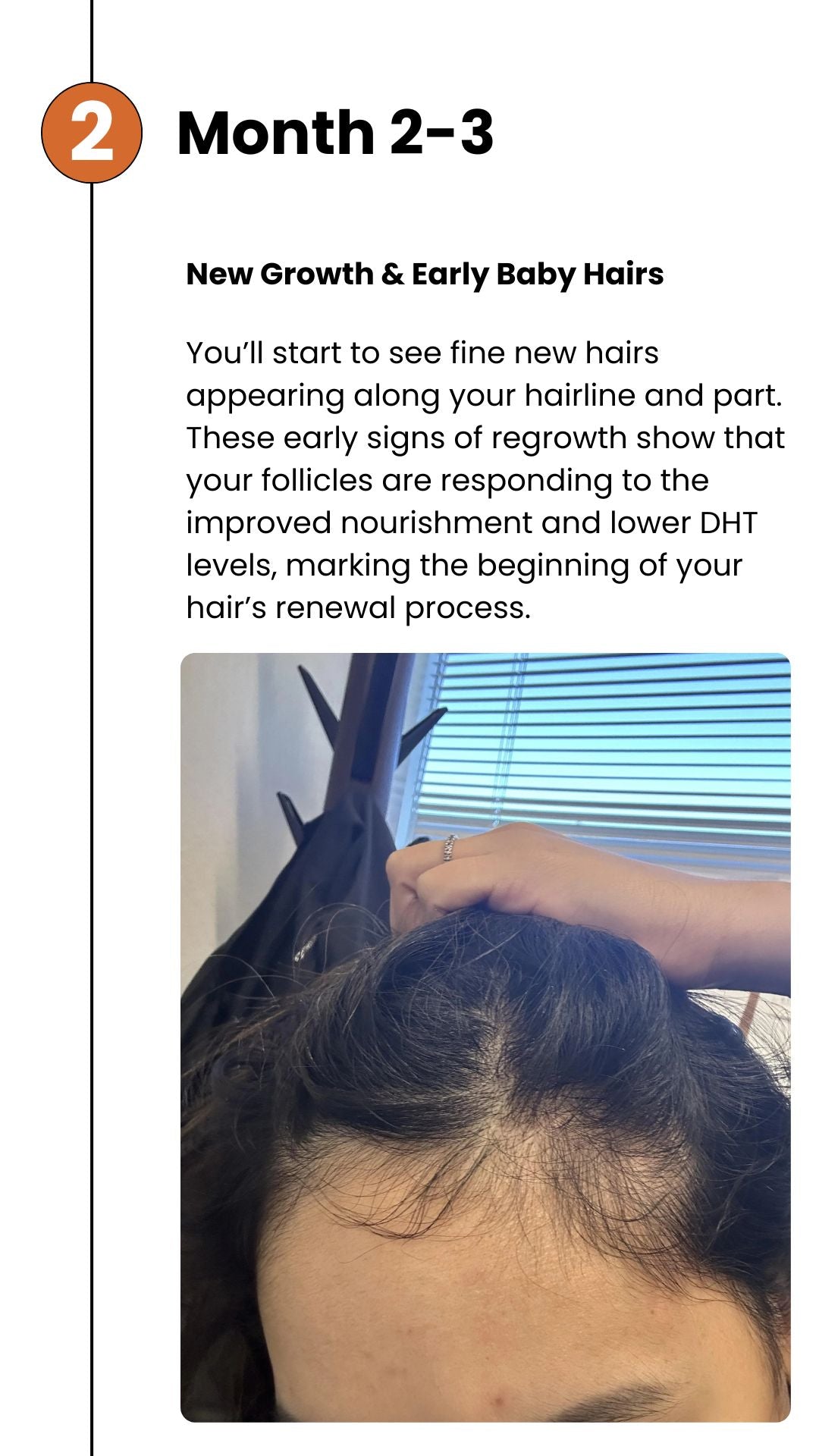 Most users notice less shedding within 2–4 weeks of consistent use. New growth often appears around months 2–3, with more visible improvements in thinning areas after 4+ months of daily use. Keep in mind that hair growth is gradual, and results may vary from person to person.