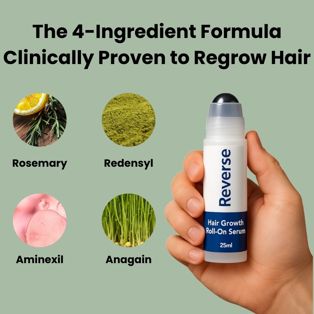 No drugs, no gimmicks. Reverse uses a clinically dosed mix of Redensyl, Rosemary, Aminexil, and Anagain — ingredients backed by real science, not side effects.